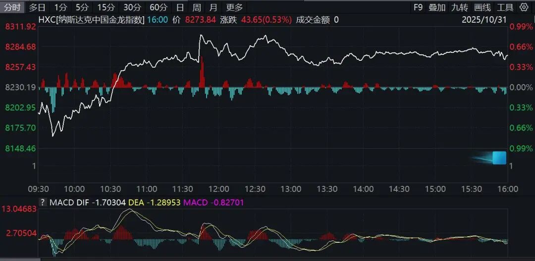 纳斯达克中国金龙指数收涨0.53%,10月累跌4.19%,终结此前月线5连涨。个股方面,蔚来涨超3%,小鹏汽车涨超2%,爱奇艺涨近2%;阿里巴巴跌超2%,京东跌近1%。
